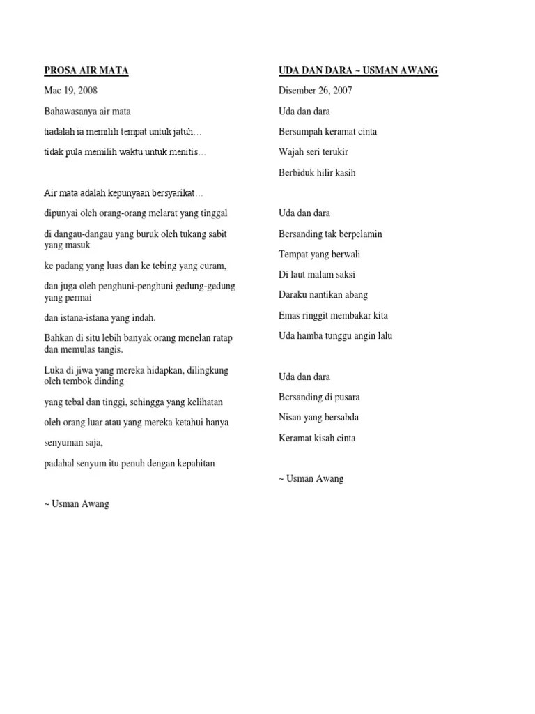 Usman Awang Puisi Cinta - Pengertian Puisi | Unsur, Jenis-Jenis Puisi dan Contohnya Secara. Apabila syarikat utusan melayu berpindah, usman awang, said zahari, dan beliau turut berhijrah. Samad ismail ditahan isa , samad said menjadi penolong khas kepada pengarang kumpulan the new straits times dan sebagai pengarang berita harian sehingga …